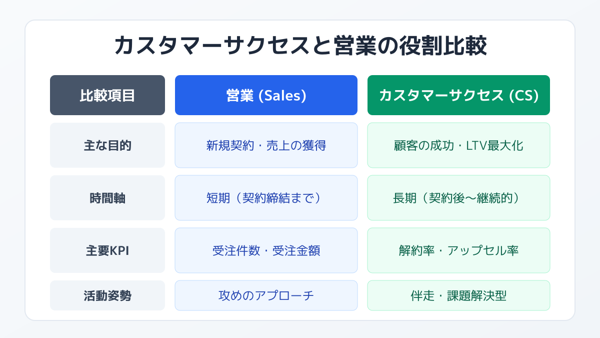 - 営業は「新規獲得・短期売上」、カスタマーサクセスは「継続利用・中長期LTV」を追う